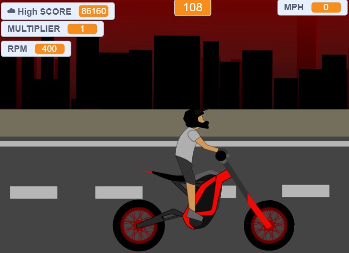 The objective in SoFlo Wheelie Life is to perform and maintain a wheelie without letting your bike crash. You’ll start on a South Florida street with your motorcycle ready to go. In order to avoid obstacles and keep control, accelerate, raise your front wheel, and hold it up for as long as you can. Your score increases as you continue to balance your wheelie. As you accelerate and encounter traffic, the difficulty increases, putting your accuracy and quick thinking to the test.